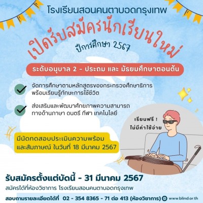 โรงเรียนสอนคนตาบอดกรุงเทพ ภายใต้การดำเนินงานของ มูลนิธิช่วยคนตาบอดแห่งประเทศ ในพระบรมราชินูปถัมภ์ เปิดรับสมัครนักเรียนใหม่ โดยเปิดรับผู้พิการทางการเห็นทั้งชายและหญิง เข้าเรียนฟรีไม่มีค่าใช้จ่าย ทั้งแบบอยู่ประจำและไปกลับ เปิดรับนักเรียนตั้งแต่ระดับชั้นอนุบาล 2 ถึงระดับชั้นประถมศึกษาปีที่ 6 ส่วนในระดับชั้นมัธยมศึกษา โรงเรียนจัดการศึกษาแบบเรียนรวมในโรงเรียนทั่วไปทั้งภาครัฐและภาคเอกชน รับสมัครตั้งแต่บัดนี้จนถึง 31 มีนาคม 2567 นี้