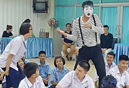 ละครใบ้คนหน้าขาวกำลังแสดงให้เด็กที่โรงเรียนเศรษฐเสถียร ในพระบรมราชูปถัมภ์ดู