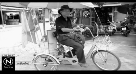 "ลุงผู้พิการขี่จักรยานขายหวย ติดธงตราสัญลักษณ์"