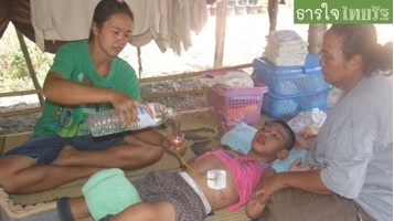 ชีวิตรันทด!!! 2 ตา-ยาย วอนผู้ใจบุญช่วยเมตตา "น้องแชมป์" หลานที่พิการทางสมอง ร่างกายทรงตัวไม่ได้ ต้องเจาะสายยางสำหรับรับประทานอาหาร น้ำ ที่ผ่านมาหมดเงินกับการรักษาจนต้องขายที่ดิน สุดท้ายต้องเขียนจดหมายขอพระราชทานความช่วยเหลือจากพระเทพฯ จนเริ่มมีหน่วยงานเข้ามาสอบถาม จึงต้องขอความเมตตาจากผู้มีจิตศรัทธาช่วยเหลือด้วย... นางอาริสา ถี่ถ้วน อายุ 30 ปี กำลังดุแลลูกชายที่นอนป่วยพิการอย่างใกล้ชิด เมื่อเวลา 12.00 น. วันที่ 11 ก.ค.58 ผู้สื่อข่าวเดินทางไปบ้านเลขที่ 199/5 ม.6 หลังโรงเรียนบ้านหนองบัว ต.ท่าชัย อ.ศรีสัชนาลัย จ.สุโขทัย หลังได้รับแจ้งพบเด็กชายพิการทางสมอง อยู่กับครอบครัวฐานะยากจน ต้องการความช่วยเหลือ พบเป็นบ้านปูนชั้นเดียวใกล้ๆ กันมีเพิงมุงหญ้าคาปลูกอยู่ ด้านในเพิงพบ นางอาริสา ถี่ถ้วน อายุ 30 ปี และนายวิชิต ทองจุล อายุ 38 ปี สามีภรรยา และตายาย กำลังดูแลประคบประหงม ด.ช.สวิตต์ ทองจุล หรือน้องแชมป์ อายุ 7 ขวบ มีอาการพิการทางสมอง ร่างกายไม่มีแรง คอพับคออ่อน ทรงตัวไม่ได้ แขนขายกไม่ได้ ต้องคอยพยุงตัวเวลานั่ง หน้าท้องเจาะสายยางไว้สำหรับให้อาหารปั่นและน้ำ ที่เท้าสวมรองเท้าเฝือก นางอาริสา เปิดเผยว่า ตนอยู่กินกับนายวิชิตมา 13 ปี ประกอบอาชีพค้าขายผลไม้ส่งตลาดไท มีลูก 1 คน คือน้องแชมป์ เมื่อแรกคลอด ลูกออกมาตัวเขียว แพทย์บอกว่ารกพันคอ ขาดอากาศหายใจ รักษาตัวอยู่ 23 วัน แพทย์อนุญาตให้กลับบ้านได้ ต่อมาพบว่าลูกไม่มีพัฒนาการ จึงพามาพบแพทย์ แพทย์ตรวจแล้วแจ้งว่าลูกพิการทางสมอง แนะให้ทำกายภาพบำบัด จึงพามาพบแพทย์ด้านกายภาพบำบัด ส่วนที่บ้านสามีและญาติจึงหาเศษวัสดุที่พอหาได้มาทำเครื่องมือเพื่อให้ลูกหัดทรงตัว ลุกนั่ง แต่ก็ไม่ค่อยได้ผล ต่อมาแพทย์แนะนำให้พาไปฝังเข็มกระตุ้นสมองที่สถาบันพัฒนาการเด็กราชนครินทร์ จ.เชียงใหม่ ซึ่งได้ผลดีขึ้น แต่ต้องทำอย่างต่อเนื่อง "ฉันและสามีจึงพาลูกไปฝังเข็มจนหมดเงิน เพราะค่าใช้จ่ายสูง ครั้งละ 15,000 บาท ไปครั้งหนึ่งใช้เวลานาน 17 วัน สามีจึงต้องเลิกขายผลไม้ มาทำงานรับจ้าง บางวันไม่มีใครจ้างก็ไม่มีเงิน พ่อแม่ตนต้องขายที่ดิน 17 ไร่ เอาเงินมารักษาหลานจนหมด รู้สึกสงสารลูกมาก กลืนอาหาร ดื่มน้ำก็ไม่ได้ ต้องเจาะหน้าท้องต่อสายยางไว้แล้วเอาวุ้นเส้น ไข่ ผัก เนื้อสัตว์ นม เกลือ น้ำตาล ปั่นรวมกัน แล้วฉีดเข้าทางสายยาง ที่เท้าต้องสวมรองเท้าเฝือกไว้เวลาทำกายภาพบำบัด เพราะขาจะพลิก ตลอดเวลา ที่ผ่านมายังไม่มีหน่วยงานใดเข้ามาช่วยเหลือเลย" นางอาริสากล่าว นางอาริสา กล่าวด้วยว่า จนต้องเขียนจดหมายถวายฎีกาขอพระบ
