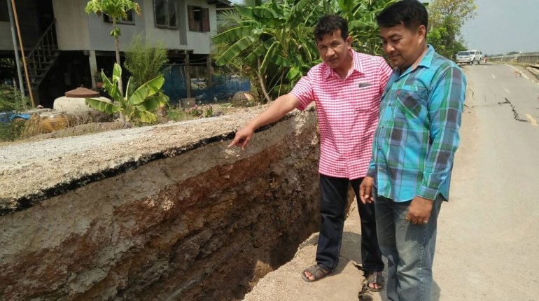 เมื่อวันที่ 17 เม.ย. 2559 นายฤทธิสรรค์ เทพพิทักษ์ นายอำเภอลาดบัวหลวง จ.พระนครศรีอยุธยา ได้รับแจ้งจากนายดานัย เรืองปราชญ์ ผู้ใหญ่บ้าน ม.2 ต.สิงหนาท ว่า[b]ถนนเลียบคลองพระยาบันลือ ม.2 ต.สิงหนาท อ.ลาดบัวหลวง ว่ามีผิวถนนเกิดรอยแยกและทรุดตัวลงขนาดกว้าง 8 เมตร ยาว 100 เมตร ลึก 1.5 เมตร[/b] ทำให้รถยนต์ไม่สามารถสัญจรได้ จึงเดินทางไปตรวจสอบ