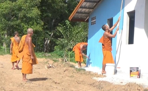 แต่งบประมาณไม่เพียงพอ ทำให้พระสงฆ์ต้องช่วยกันมาทาสีบ้านให้ทั้งหลัง หวังให้เข้าอยู่อาศัยได้ทันสิ้นเดือนมิถุนายนนี้ ซึ่งก่อนหน้านี้พระสงฆ์ฯ จากสำนักสงฆ์เขาหลักจันทร์ก็เคยมาช่วยก่ออิฐ ฉาบปูนและปูกระเบื้องมาแล้ว ซึ่งในครั้งนี้นอกจากจะช่วยกันทาสีแล้ว ยังช่วยตัดหญ้าบริเวณรอบบ้านให้ดูสะอาดตาด้วย