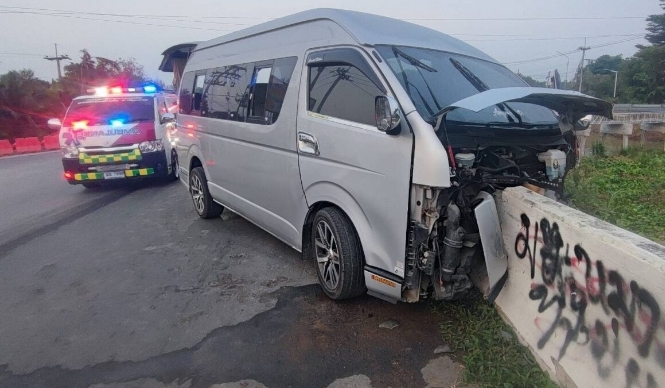 รถตู้พากลุ่มผู้พิการไปขายลอตเตอรี่ เจอกระบะตัดหน้า หักหลบไปชนแบริเออร์ เจ็บ 6